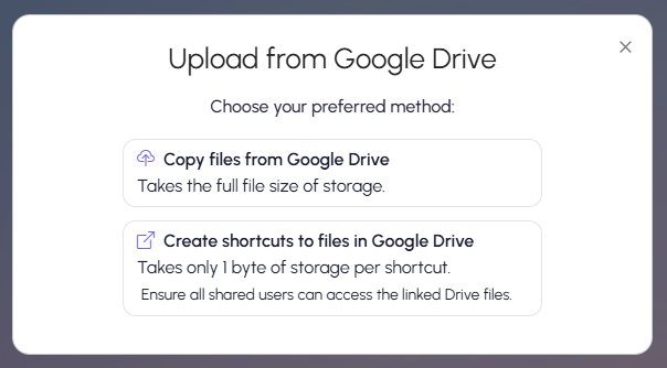 Deskfirst offers a native Google Drive integration that allows you to bring your Drive content directly into your desktop. You can either upload full files from Drive or create lightweight shortcuts that point back to your Google Drive. This gives you flexibility in storage usage and collaboration workflows.
