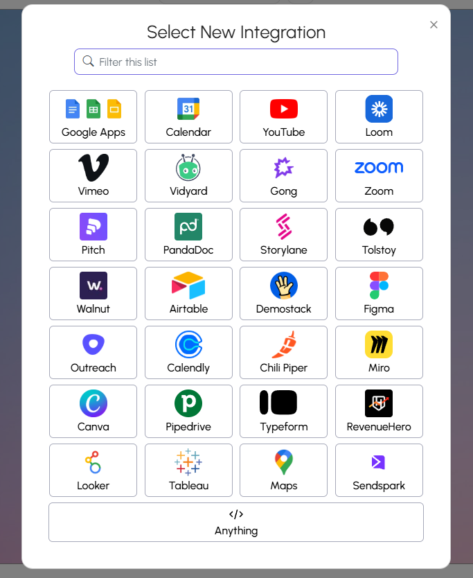 If the tool you want does not appear in the list but supports embedding, you can still embed it. Simply click Anything at the bottom of the list. This allows you to embed nearly any application, including standard websites, as long as they provide a shareable link or embed code.