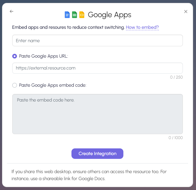 Deskfirst lets you bring your favorite tools directly into your web desktops. You can embed Google Apps, calendars, video platforms, call tools, design tools, and many other third-party applications. This creates a seamless environment that reduces context switching and brings all your resources together in one place.