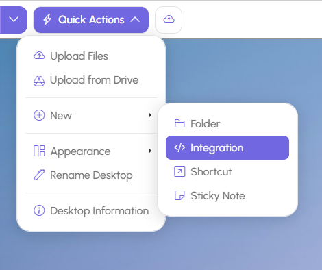You can create a new integration from the Quick Actions menu or by right clicking inside your desktop.
